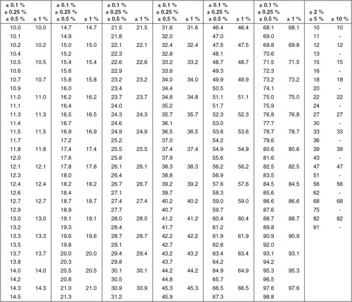 通常电阻阻值都是标准,上图给出了不同精度(容差)的电阻的标准阻值,通常乘以10的倍数或除以10的倍数,就可以得到所有阻值。