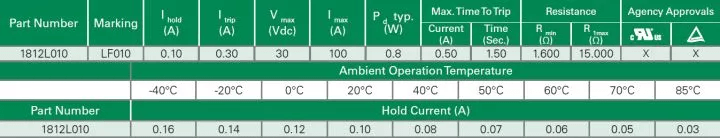 选用PTC的时候,首先要考虑设计工作电流,不能超过PTC保持电流,此时PTC可以保持低阻抗状态。PTC的保持电流会随着工作温度的升高而降低,因此,工作温度时需要考虑的重要因素。