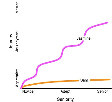 学徒模式:Sam,跟同一个师傅连续学了15年。另一位是Jasmine,换了多个工作(自然也换了多个师傅)——一直提升技能。下面这张图表示出了二者的区别。详细内容参见:http://www.infoq.com/cn/news/2009/03/models_apprenticeship