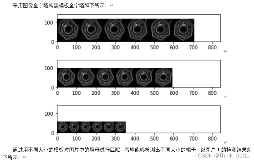 本实验采用计算机视觉中模板匹配的相关技术,通过分析本实验中需要检测的场景与螺母的分布与位置,可以发现图片中螺母的形状是平躺,但存在不同大小和颜色的螺母,而且螺母之间间距也有稀疏不同,而且存在与螺母相似度较高的圆形物体,对多目标检测带来较大的影响。最后一张检测图像的检测场景更为复杂,由于存在许多干扰的元素。给螺母的检测带来较大的困难。为此考虑到一些解决方法,其中通过建立螺母的模板进行检测,分别利用到了彩色模板和边缘模板,以及轮廓模板。对于采用的方法有图像金字塔和距离变换。同时由于需要检测的螺母是多个,因此采用进行多目标匹配的方法。