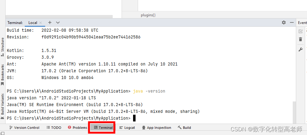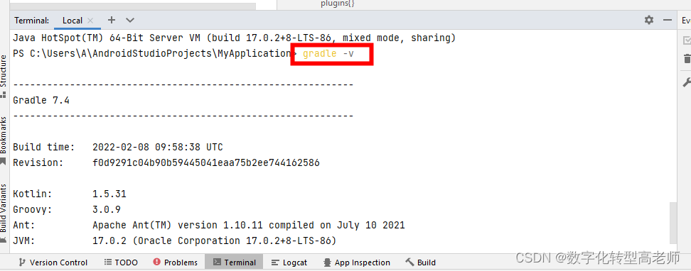 cmd或Android Studio Terminal 测试下gradle是否安装成功。