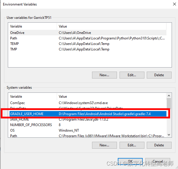 计算机图标-右击属性-高级系统设置-环境变量,点击 新建New ,输入变量GRADLE_USER_HOME,变量值根据实际情况gradle的安装位置 决定的。再找到Path,在原内容后面加入%GRADLE_USER_HOME%\bin .。