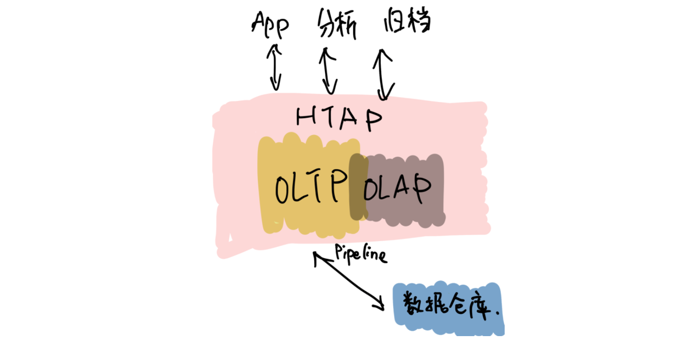 另一个例子是 HTAP,如果关注的数据库的发展的话,最近一定对 HTAP 这个词很熟悉,其实在我看来的 HTAP 的本质在于上面提到的覆盖度,下面是一个典型的架构: