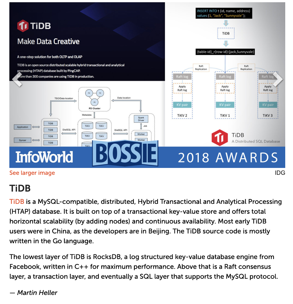 2018 年 9 月 26 日 TiDB 入选 InfoWorld | Bossie Awards 最佳开源数据存储与数据分析平台奖,目前 TiDB Repo Star 数超过 23000,Contributor 超过 400 人,其存储层 TiKV 已经成为 CNCF 的孵化项目。