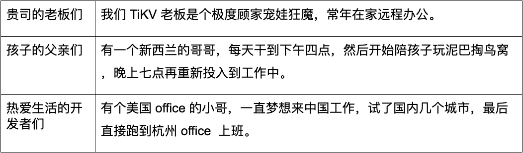 加入我司时,我是一个已婚未育的女性,面试时,我也是无比耿直地跟老板说我可能会在未来两年生孩子,当时坐标北京。首先,我个人是很喜欢自由努力的北京城,但是作为一个伟大的中华民族传统女性,我确实需要在适当的年龄去孕育下一代。在北京孕育下一代,无论是在生理、心理、经济和精神上,都是有巨大的压力的。如果换城市,就要就此中断职业生涯,是我绝对无法接受的。但是在 PingCAP,我实现了职业生涯上的无痕切换城市,从怀孕五个月回老家远程办公,到生完孩子顺利切换到杭州办公室。类似的故事在我们这不缺: