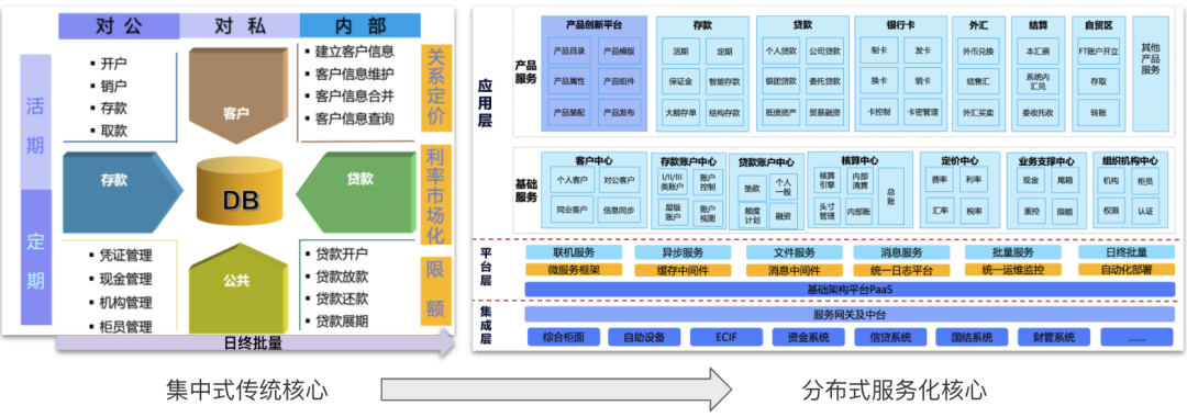 架构如上图所示,整个核心交易的应用侧根据应用逻辑做一个拆分,这也是现在新一代核心应用结构的演进趋势。