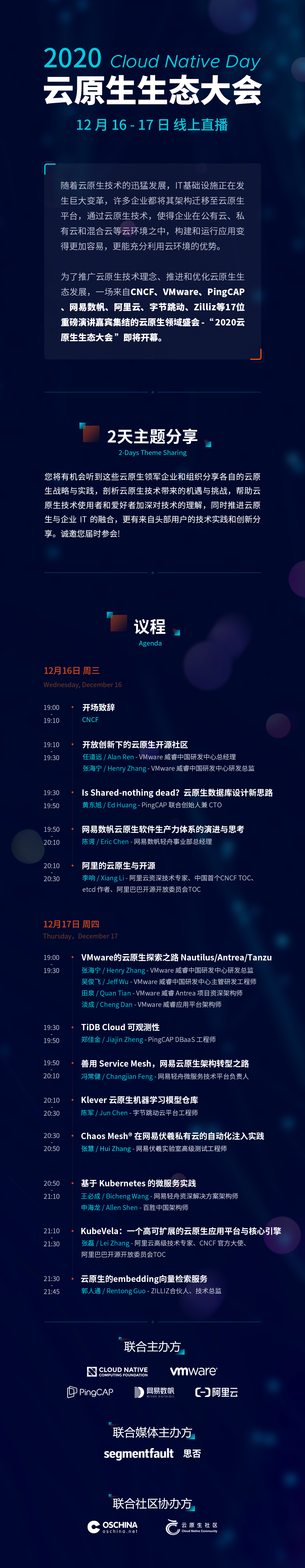 作为早期的云原生技术布道者与实践者,PingCAP 联手 CNCF、VMware 、网易数帆与阿里云,共同举办 2020 Cloud Native Day(2020 云原生生态大会)。为期两天的线上主题分享,您将有机会听到云原生领军企业和组织分享的云原生战略与实践,剖析云原生技术带来的挑战和机遇,推进云原生技术与企业 IT 的融合,更有来自头部用户的技术实践和创新分享。