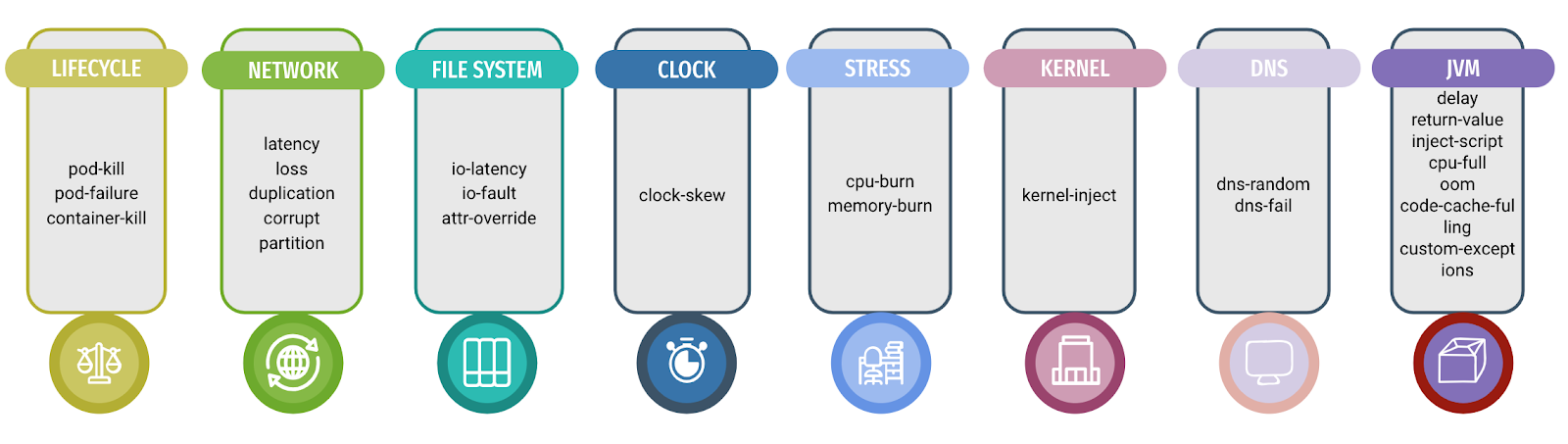 刚开源的时候,Chaos Mesh 支持 PodChaos,NetworkChaos 以及 IOChaos, 经过这一年的不断丰富,Chaos Mesh 已经能够全方位的对网路、时间、JVM 应用、文件系统、操作系统等进行故障注入。这一年中 Chaos Mesh 共新增 5 类故障类型: