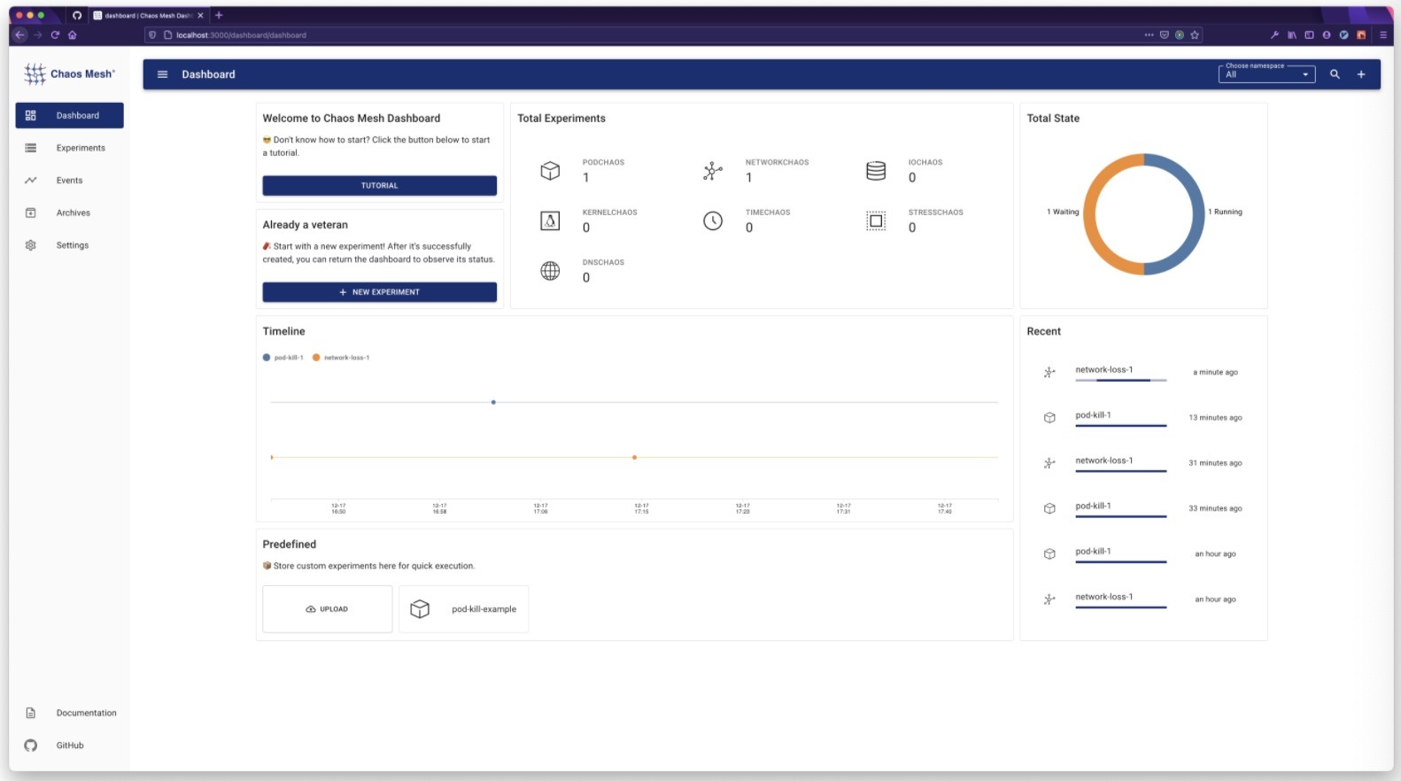 为了能够让用户快速体验 Chaos Mesh,我们单独提供了一键安装脚本,用户只需要执行一条命令,就可以在本地快速地体验 Chaos Mesh。此外,我们还实现了全新组件 Chaos Dashboard,Chaos Dashboard 极大地简化了管理混沌实验的复杂度,用户可以直接通过可视化界面来管理和监控混沌实验。