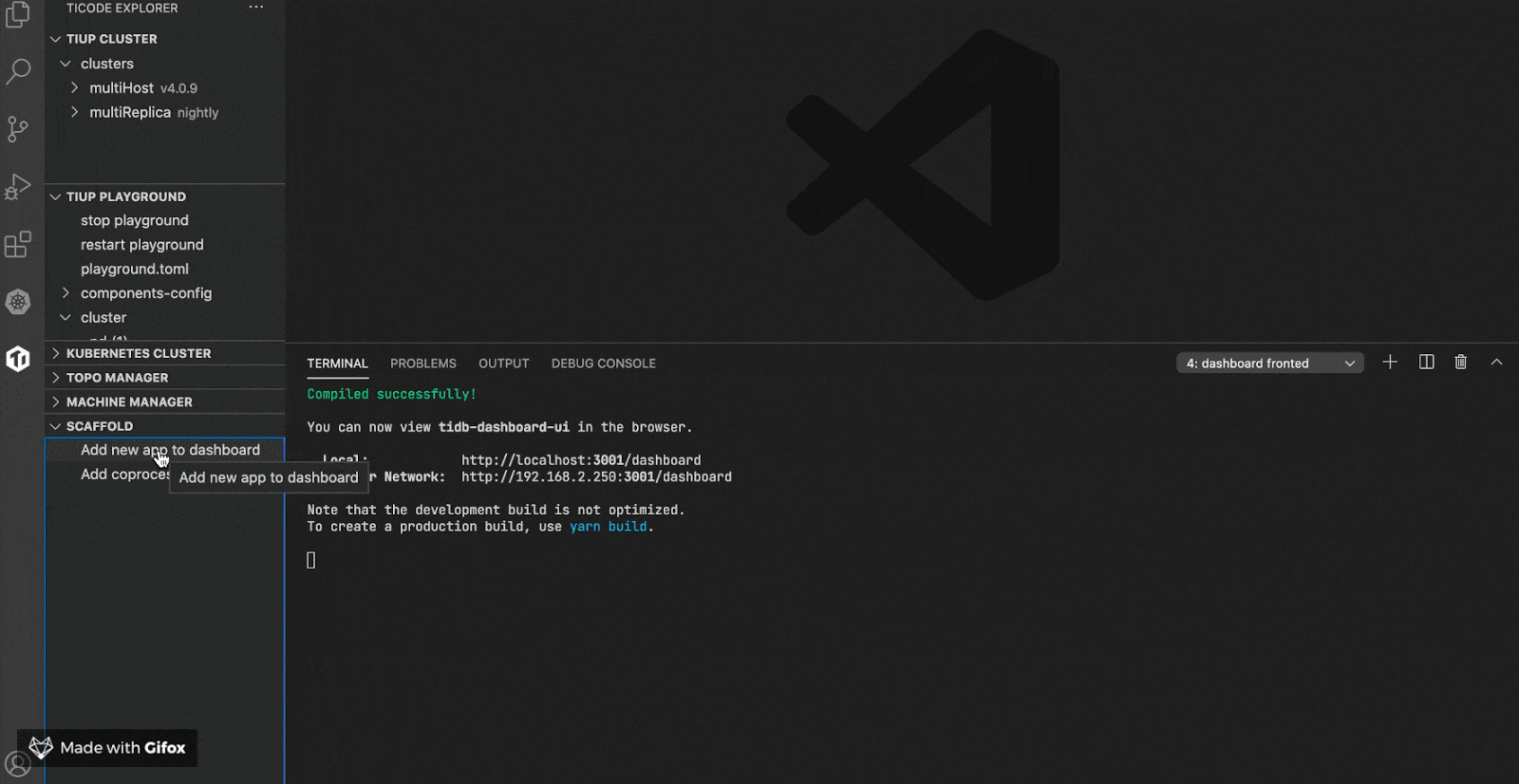 一键为 TiDB 生态中某个或某几个组件添加一项新功能,目前已经拥有一键为 TiDB Dashboard 添加一个 APP 的能力,添加之后用户只需要修改默认实现就能快速将自己想要的功能添加到 TiDB 生态当中。