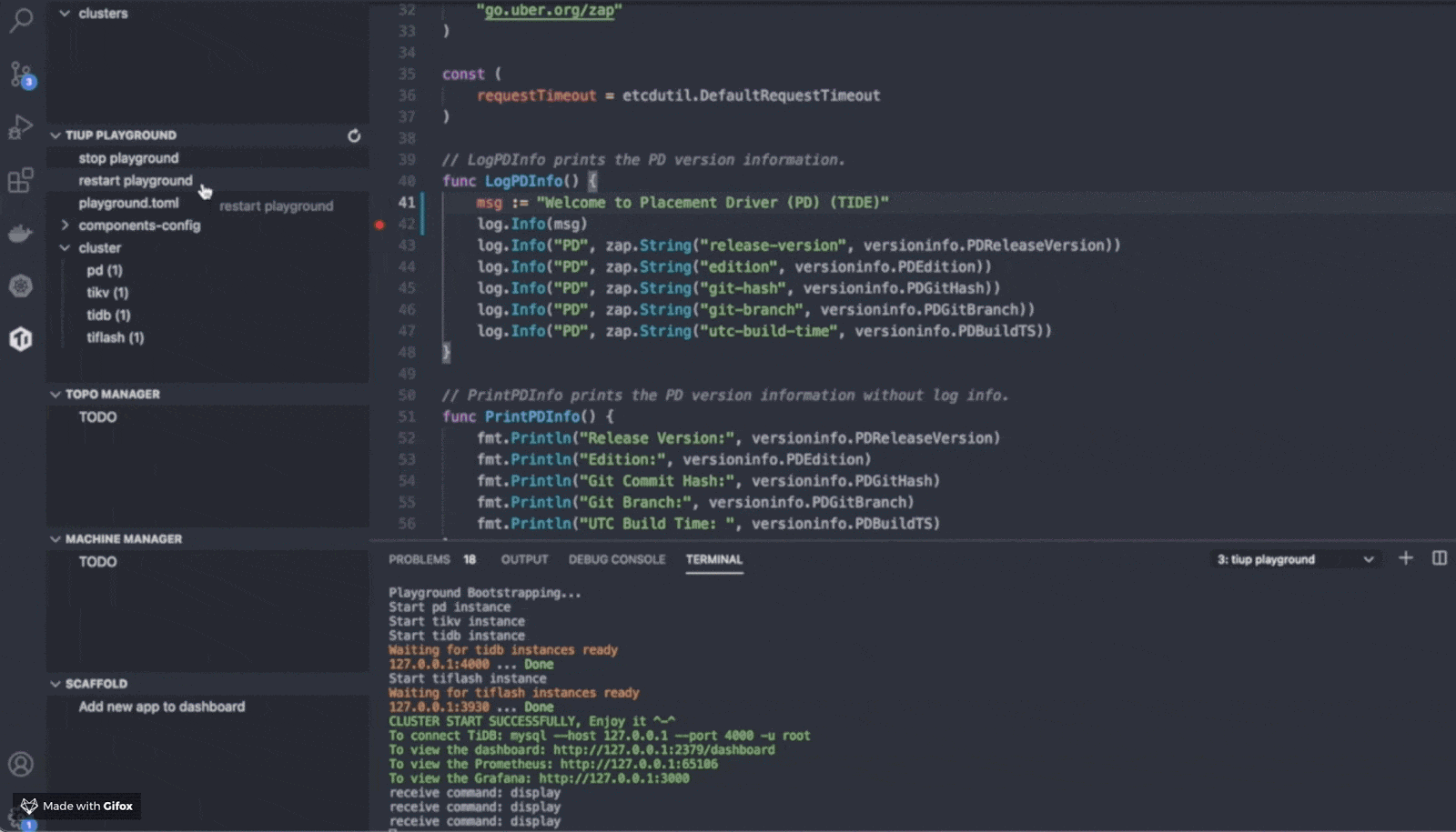 团队成员李逸龙从这个 idea 受到了启发,他发现 TiDB/TiKV/PD 的研发同学在日常开发时,需要自己手动替换服务器上的二进制和修改组件配置,重启后再手动去捞日志看结果,过程非常繁琐,同时在本地对各大组件同时进行 debug 单步调试也很复杂。他就想到能不能用 VSCode 插件把这些工作都自动化处理呢?类似 K8S 的 VSCode 插件,通过这个插件不用敲一行代码就可以管理 K8S 集群。于是研发工程师李逸龙、前端工程师黄宝灵和 K8S 专家吴叶磊三个人一拍即合,都觉得这个 idea 太好了,直击痛点!
