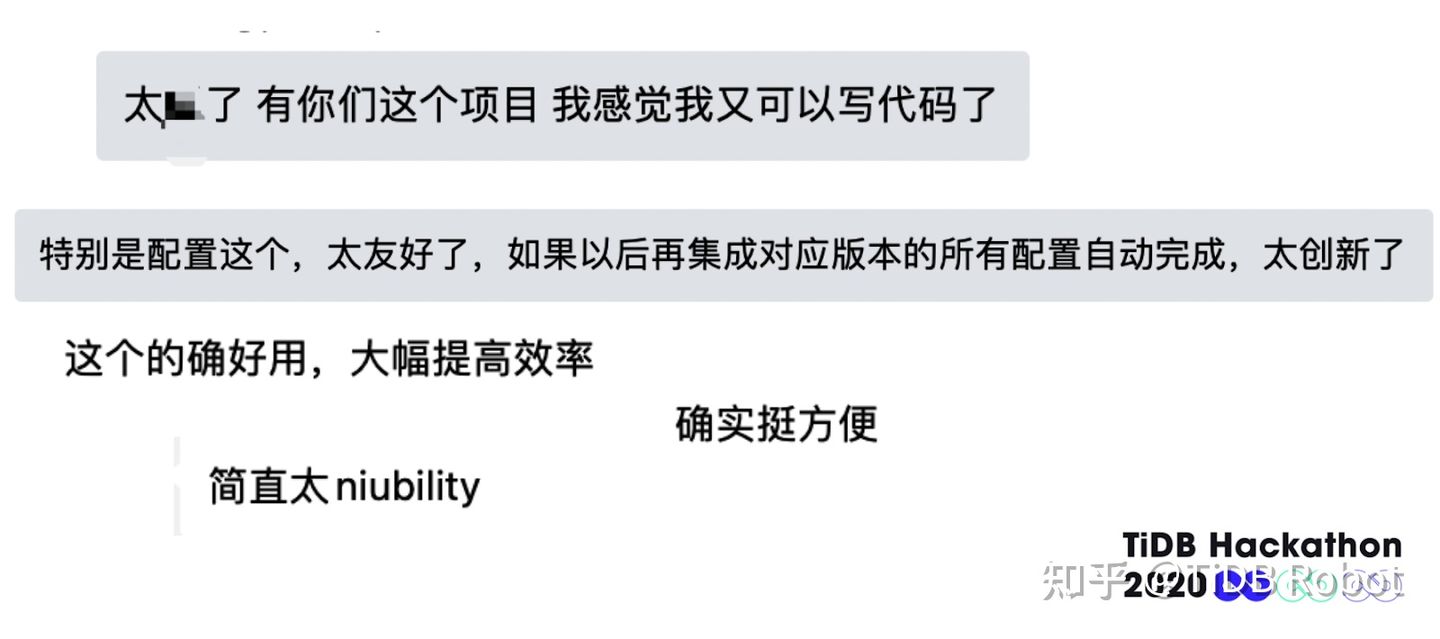 项目开发的过程运用了边开发边推广策略,团队成员也表示参赛意图之一就是为了推广 TiDE,从而得到更多种子用户的反馈,再进而优化功能,在这其中也发生了几件意想不到的趣事。在 Hackathon 比赛现场,有一位友 team 的开发者遇到了 TiUP 的使用困难,在小龙的热心帮助下,使用 TiDE 解决了 TiUP 部署的权限问题,意外当场收获用户一枚,这位开发者在试用 TiDE 后不禁发出了感叹“TiDE 能提升我的开发效率,解放我的思路,确实好用,懂的都懂。”