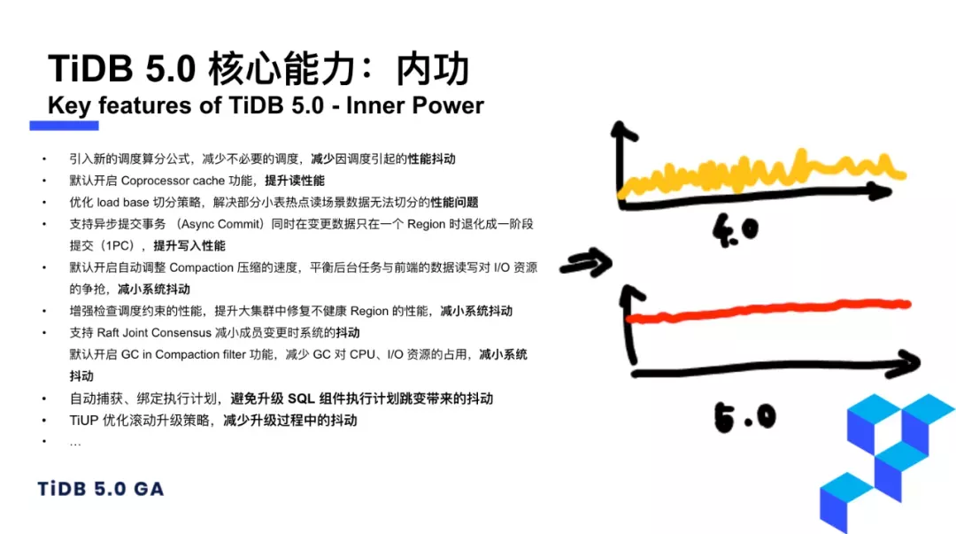 **从 4.0 版本到 5.0 版,TiDB 做了大量优化,包括减少性能抖动、提升性能、提升安全性等,上图中能看到这条黄色曲线最终变成了红色曲线,减少抖动将近 100 项。**对于一个企业级数据库来说,内功其实是非常重要的一个壁垒。