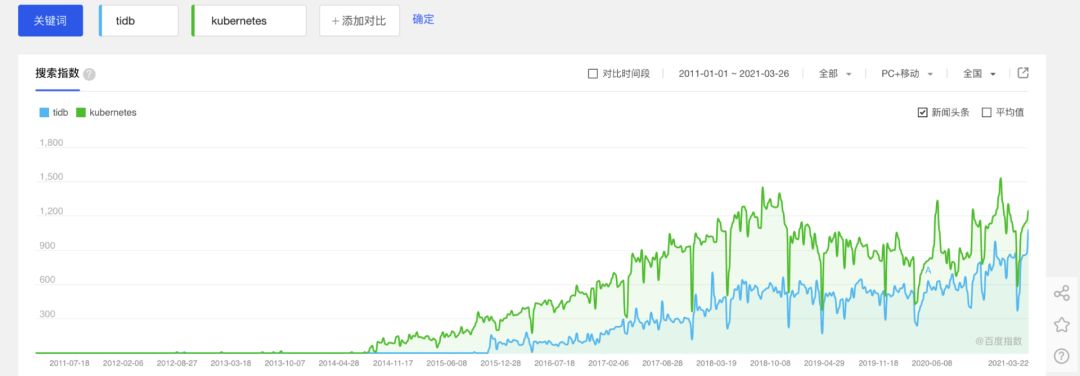 好消息是,这个阶段终将会过去,bug 这种东西嘛,改掉一个就少一个,产品也会在这个阶段逐渐摸索到自己的定位和最佳实践,而在最佳实践这个路径上,产品会变得越来越稳定和聚焦。如果定位是市场刚需,**那么就会迎来一个高速增长阶段(成熟期),而社区的生态也会随着产品的普及开始加速度发展。**这个从上图的 Kubernetes 和 TiDB 的搜索指数里面能看到这个鸿沟的一个侧写。