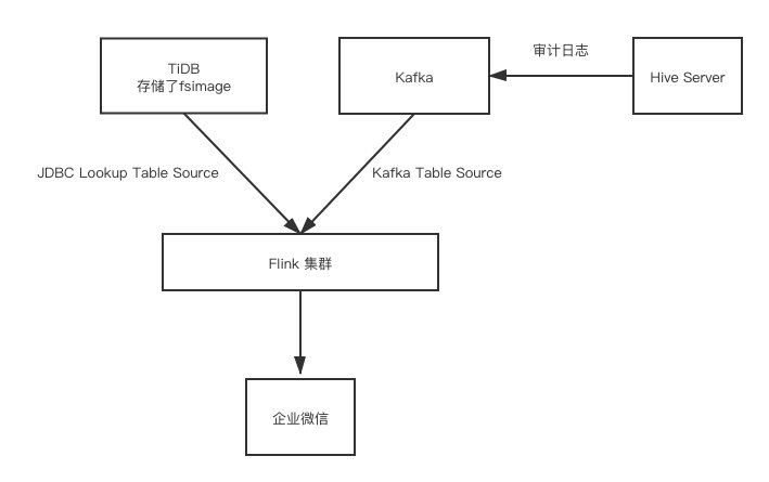 我们将审计日志实时发送至 Kafka,再用 Flink 实时去消费 Kafka 内的审计日志,利用 KafkaTableSource 和 Json Format 将 Kafka 作为流表,再利用 JdbcLookupTableSource 将 TiDB 作为维表,便可轻松计算出每条 SQL 扫描的数据量再进行报警判断。