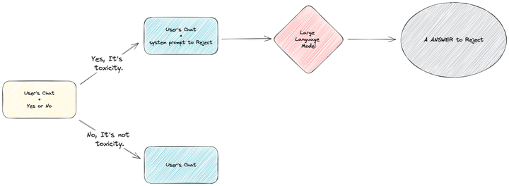 当系统发现产出的内容是 “Yes” 时,会引导流程进入毒性内容回复流程。此时,会将一个拒绝回答用户问题的系统提示词和用户对应的问题提交给 GPT,最终用户会得到一个拒绝回答的回复。