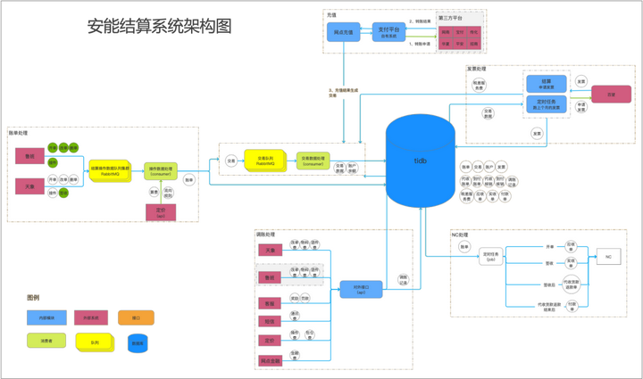 安能结算系统作为公司最核心的业务系统,承载了总部 与末端 加盟商网点所有费用结算业务,包括: 账户管理、充值、开票、交易、调账、对账、代收、代付、税差等全费用结算业务流程处理。 从系统的逻辑架构图来看,其功能及业务处理流程也是相对复杂的,目前该套系统承载业务量: 日均 450,000 票,出货量 48,000 吨,支持末端 36,000 家网点实时开单算费扣款和定时批处理调账,日均用户数 3,800,调用量 5,000 万以上。