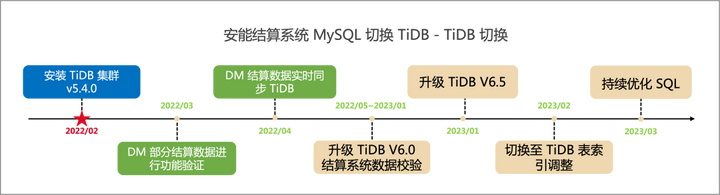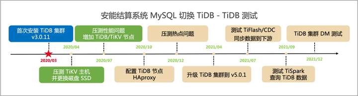 即便如此,TiDB 在安能从测试到切换上线还是经历了 3 年左右的时间,主要分为测试和数据校验两个阶段。在测试阶段,安能从 TiDB 3.0 版本开始测试,持续到 5.4 版本,在这个过程中充分测试了 TiDB 每一个重要版本的核心特性和重要功能,也测试了 TiDB 推出的诸多工具,见证了 TiDB 产品成长和打磨过程。