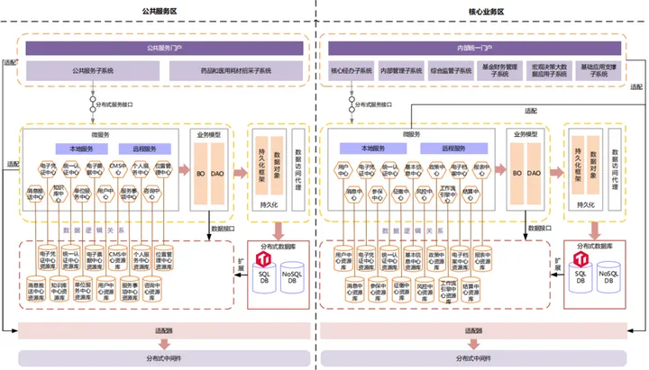业务中台是将医疗保障信息平台各子系统间可共享的业务能力抽取出来,形成不同的“业务中心”,提供共享业务服务,具有高内聚、低耦合特点。业务中心拥有独立的数据资源,具备独立运营能力,能独立部署,可通过沉淀支撑上层应用系统的快速迭代形成创新能力,实现业务的高效共享和复用,从而解决系统扩展性能力差、业务功能重复建设、系统稳定性差和无法支撑高并发等问题。