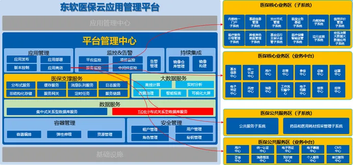 东软医保云应用管理平台采用分布式云架构设计。在基础设施层上,基于云平台提供分布式服务支撑。管理平台作为系统运行的主要载体,承载业务应用,满足数据存储、传输、交换和应用的需求,以一站式的方式提供医保通用支撑服务和软件,为医疗保障应用框架及应用系统提供标准化支撑,实现应用自动化、智能化部署与运维、通过先进、高效、便捷、安全的管理平台推进医保信息化建设。TiDB 分布式数据库做为整个管理平台的核心组件无缝支持了医保行业客户数据、交易数据的存储、处理和实时展示的需求。