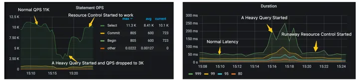 譬如在 7.5 里面,我们花了大量的经历仍然去完善和优化 resource control,譬如我们引入了 runaway query 机制,给用户提供了对于 heavy query 的控制机制,更好的防止了一些突发 heavy query 引起的 TP 业务抖动问题,效果如下: