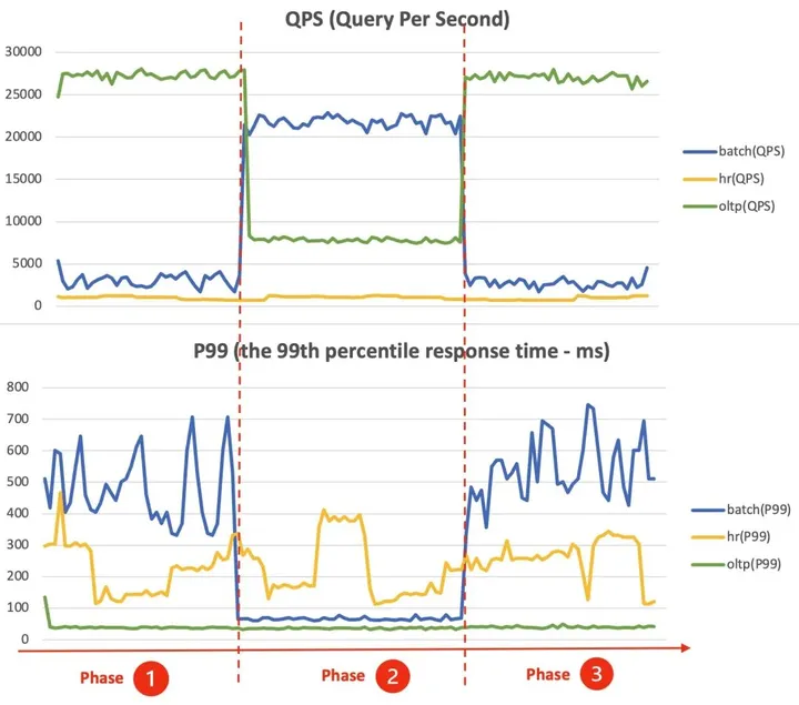 挑战还不仅仅限于此,又是北美的一个重要客户,他们将他们自己非常核心的一个元信息管理的业务放到了 TiDB 上面,然后这个业务大部分时候都只是涉及到 meta 的简单操作,属于 TP workload,不过也有不少的时候,他们需要直接进行一些轻量级的复杂查询,而且明确要求了当这样的复杂查询过来的时候,几乎完全不能影响他们的 TP workload。这个在 TiDB 6.5 还是比较有挑战的。而不光是这个客户,我们也发现,越来越多的客户将多个负载跑在一个 TiDB 集群,负载之间的隔离就变得尤其重要。于是我们跟这个客户一起开始了 resource control 的开发,也取得了非常不错的效果。