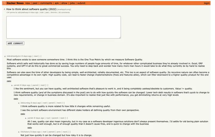 ● 一个很有意思的事情,在我当天 2024-02-24 发布这篇文章的时候,Hacker News 上也有一篇讨论软件质量的帖子上了首页, How to think about software quality (2022) | Hacker News ,看来不只是我,大概率全球的开发者也在头疼这个问题吧。