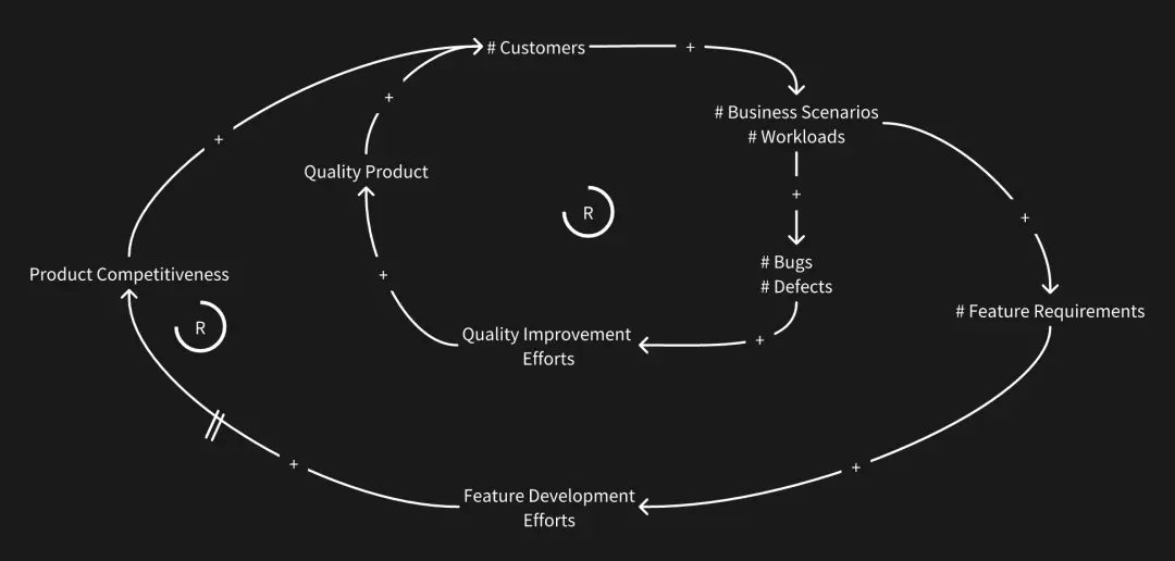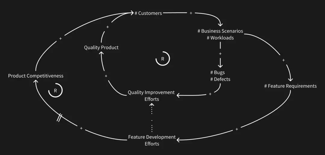 继续上面的因果回路,我们可以扩展另一个增强回路。当我们承接了客户更多的场景和负载之后,客户对我们提出了更多的要求,也就是会给我们提更多的功能需求。在这种情况下,我们就需要投入到新功能的开发当中。 新 功能做的越多 ,我们的产品在更多的维度上就更有竞争力,自然就会吸引更多的客户去使用。