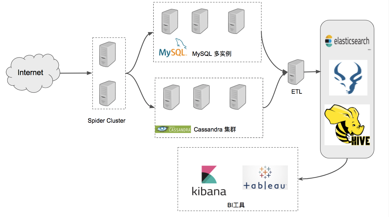 起初,一面数据的核心系统采用的是多个 MySQL 实例和一个 Cassandra 集群。MySQL 多实例集群主要存储指定特征的爬虫数据,Cassandra 主要存储数据量大、不适合存储 MySQL 的全页面缓存的数据。在数据量/请求量小的时候系统运行正常。下图为:一面数据改造前系统构架图