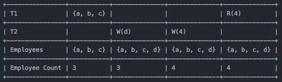 假设现在 T1 按照某个条件读取到了所有雇员 a,b,c,这时候 count 是 3,然后 T2 插入了一个新的雇员 d,同时更新了 count 为 4,但这时候 T1 在读取 count 的时候会得到 4,已经跟之前读取到的 a,b,c 冲突了。