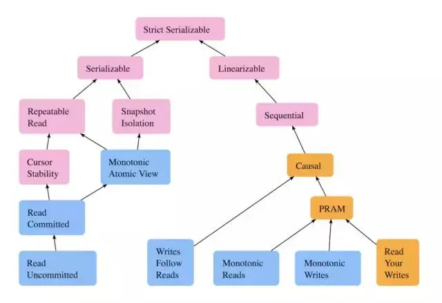 如果大家仔细观察,可以发现,从根节点 Strict Serializable,其实是有两个分支的,一个对应的就是数据库里面的 Isolation(ACID 里面的 I),另一个其实对应的是分布式系统的 Consistency(CAP 里面的 C),在 HATs 里面,叫做 Session Guarantees。