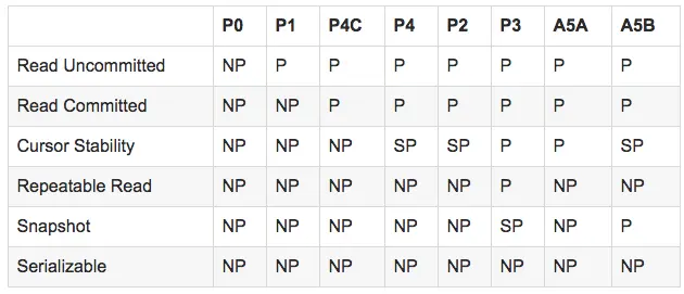 上面我们介绍了不同的异常情况,下面的表格说明了,在不同的隔离级别下面,那些异常情况可能发生: