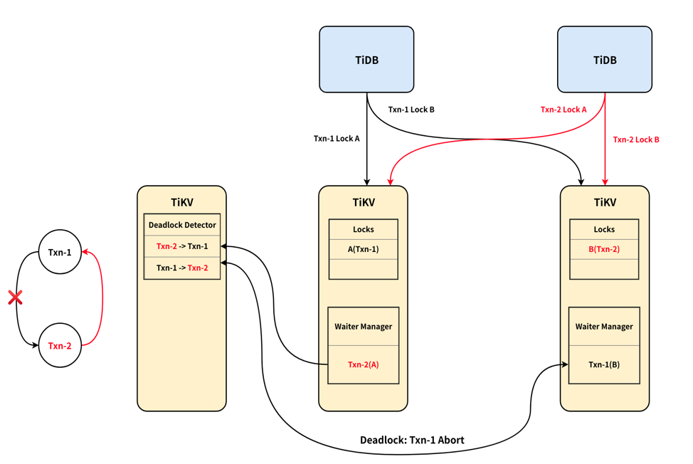 但是引入悲观锁和可交互式事务,就可能引入另外一个问题:死锁。这个问题其实在乐观事务模型下是不存在的,因为已知所有需要加锁的行,所以可以按照顺序加锁,就自然避免了死锁(实际 TiKV 的实现里,乐观锁不是顺序加的锁,是并发加的锁,只是锁超时时间很短,死锁也可以很快重试)。但是悲观事务的上锁顺序是不确定的,因为是可交互事务,举个例子: