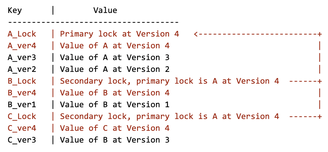 假设我们这个事务要 Update (A, B, C, Version 4),第一阶段,我们选出的 Primary row 是 A,那么第一阶段后,数据库的 Layout 会变成: