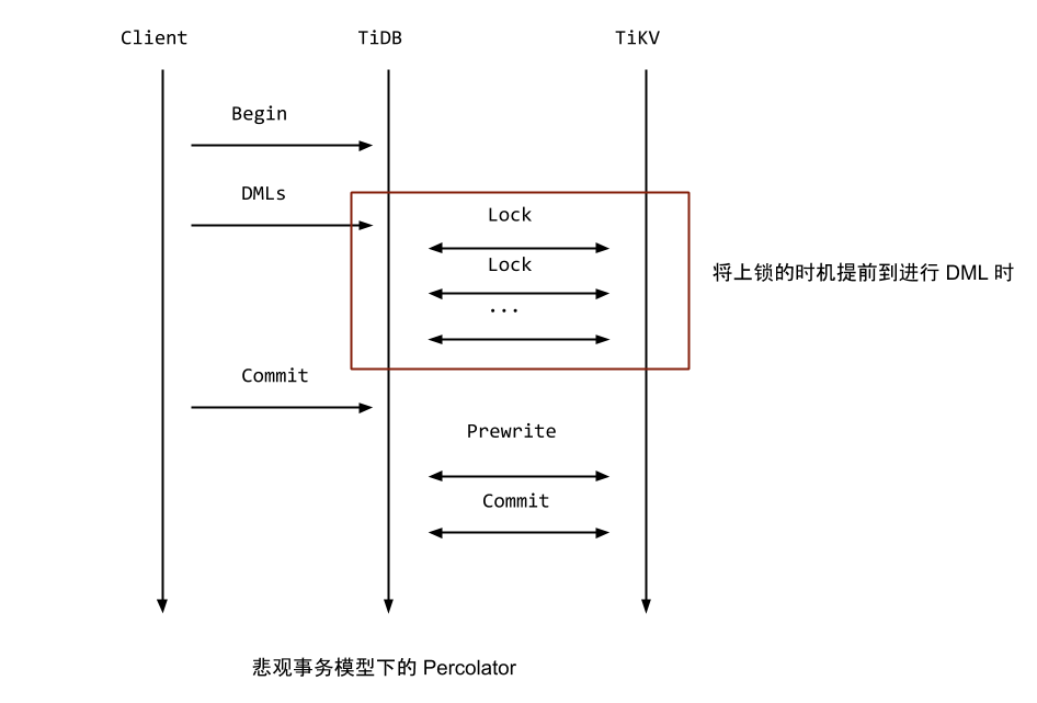 TiDB 实现悲观事务的方式很聪明而且优雅,我们仔细思考了 Percolator 的模型发现,其实我们只要将在客户端调用 Commit 时候进行两阶段提交这个行为稍微改造一下,将第一阶段上锁和等锁提前到在事务中执行 DML 的过程中不就可以了吗,就像这样: