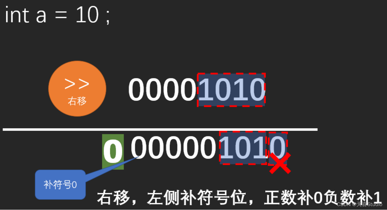 注:由于首位符号位问题,正整数右移首位补0,负数补1
