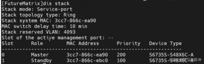 stack slot 0 priority 100堆叠槽位编号0优先级为100主设备要设置比100大