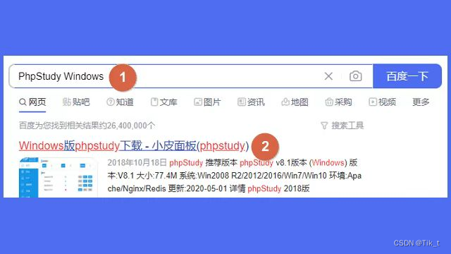 首先,在搜索引擎的搜索框输入【PhpStudy Windows】进行搜索,然后点击【Windows版phpstudy下载 - 小皮面板(phpstudy)】即可进入下载页面。需要注意的是,不要搜索PhpStudy,如果这样搜索,找到就是Linux版本的页面了。