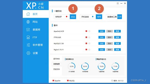 运行PhpStudy以后,可以看到V8.1版本的界面已经做得非常漂亮了,这里要给开发者们点个大大的赞!这时,系统运行的只是PhpStudy软件本身,其实Nginx、Apache、MySQL、PHP等环境并没有运行起来,需要按需启动。一般情况下,我们用得最多的就是Nginx+MySQL+PHP的组合,这种配置也是在生产环境用得最多的,所以强烈推荐。另外,软件默认的开启自启一般不需要打开,否则会影响开机速度,建议关闭。所以,我们需要将【一键启动】下面的【WNMP】选项【启动】,并将【开机启动】选项【停用】。