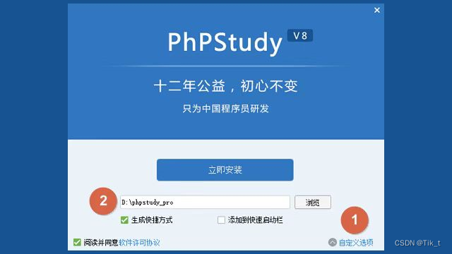 在解压的文件夹里,选择名为【phpstudy_x64_8.1.1.3.exe】的文件双击打开,或右键选择【以管理员身份运行】,开始安装。注意,在弹出的第一个安装界面中,一定要点击【自定义选项】查看一下默认的安装目录,如果是C盘以外的分区没有问题。