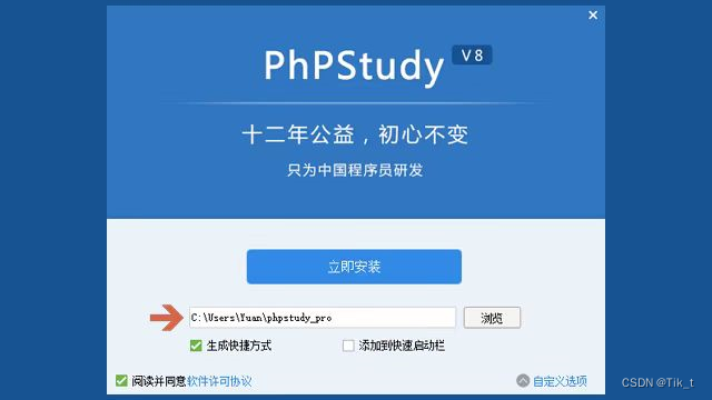 选择安装目录之后,就可以点击【立即安装】了,很快就会安装完成。然后点击桌面生成的快捷图标就可以运行PhpStudy。
