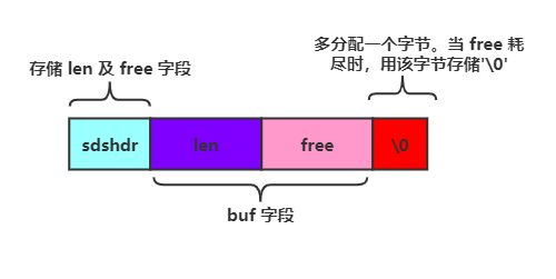 细心的读者可能注意到了,sdscatlen函数在 buf 的尾部追加了一个 '\0'。这是为了当SDS中不包含特殊字符时,可以复用一部分 C-String 的函数。为了保存 '\0',sds 对象实际占用的内存长度为 sizeof(sdshdr) + sdshdr::len + sdshdr::free + 1。