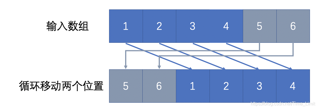 给出一个长度为 n n n 的一维数组 a r r arr arr,将 a r r arr arr 中的每个元素循环向右移动 m m m 个位置。更严格一点的定义是:将原本在位置 i i i 处的元素移动至 ( i + m ) m o d n (i+m)\bmod n (i+m)modn 处。