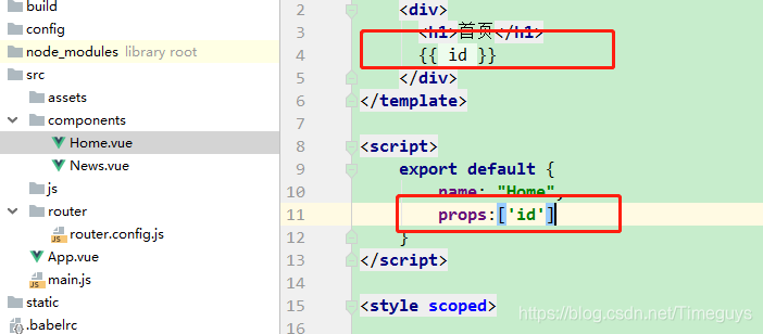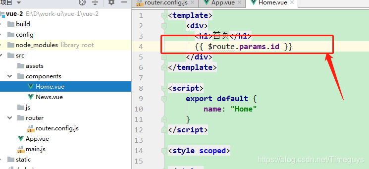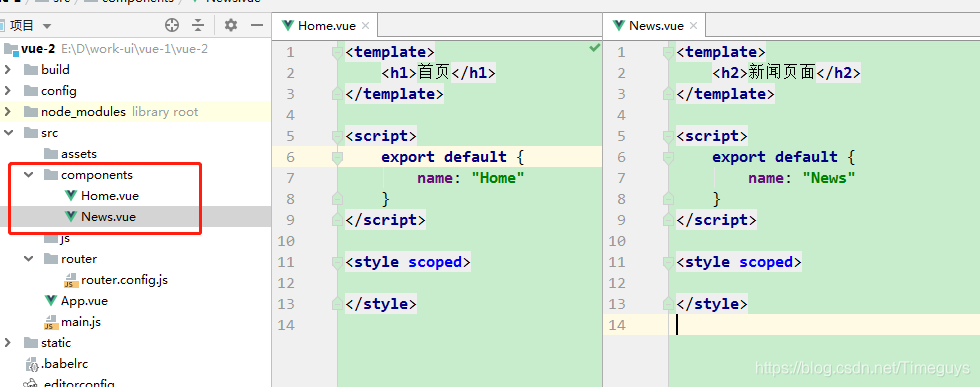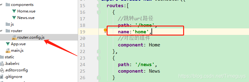 //路由配置文件 //导入vue和vue-router模块 import VueRouter from 'vue-router' import Vue from 'vue' //导入自定义组件 import Home from '../components/Home' import News from '../components/News' //Vue启用Router Vue.use(VueRouter); export default new VueRouter({ routes:[ { //跳转url路径 path: '/home', //对应的组件 component: Home }, { path: '/news', component: News } ] })6、在main.js中引入router进行使用: