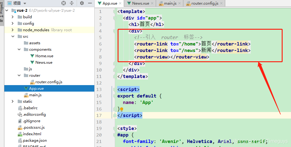 import Vue from 'vue' import App from './App' import router from './router/router.config' Vue.config.productionTip=false new Vue({ el: '#app', //让vue使用router模块 router, render: h => h(App), })7、在App.vue中引入router标签即可实现路由功能: