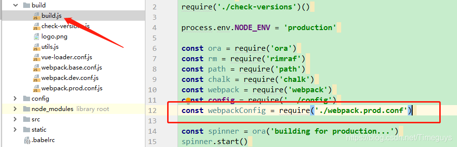 npm run build: 编译时使用的build.js文件,通过build.js文件里可以看到代理加载了webpack.prod.js里面的配置,属于生产环境。