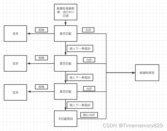 匹配规则:至上而下,逐一匹配,上调匹配按照上条执行,不在查看下条; 在思科体系中,末尾隐含拒绝所有,在华为体系中,末尾隐含允许所有。