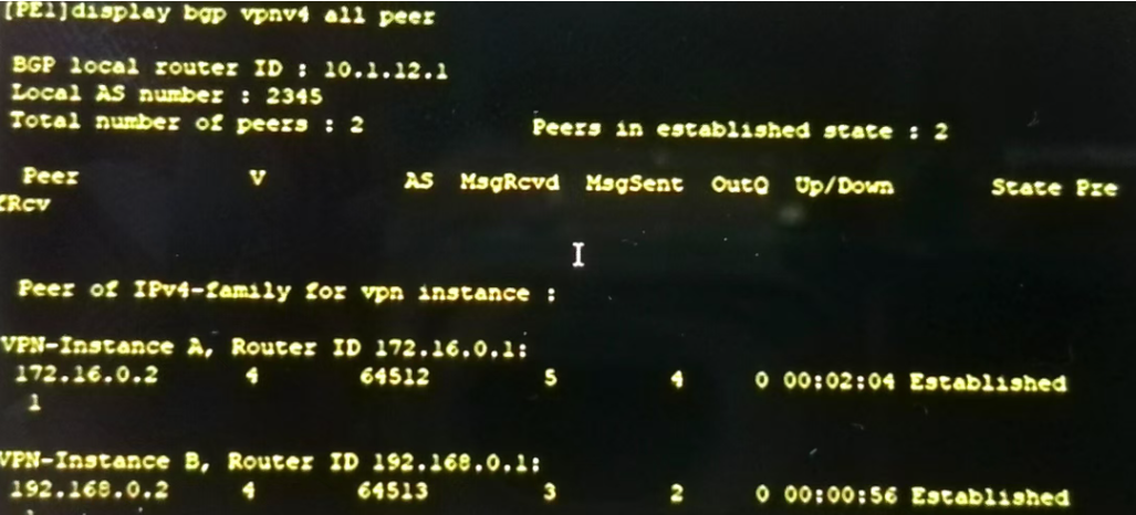 [PE1-bgp]ipv4-family vpn-instance A ---进入VPN视图,在该视图中建立邻居;