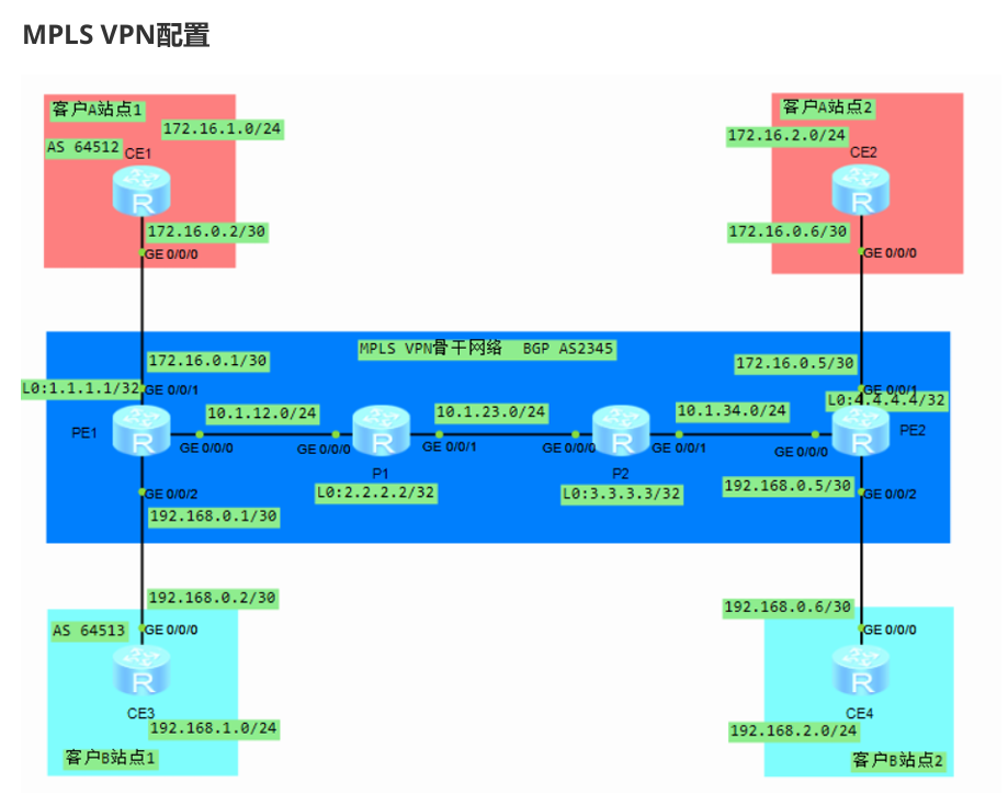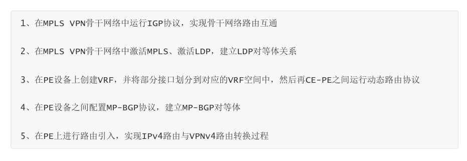 4. 通过 MP-BGP(多协议 BGP)传递 VPNv4 路由,实现不同 PE 上 VRF 路由的互通。