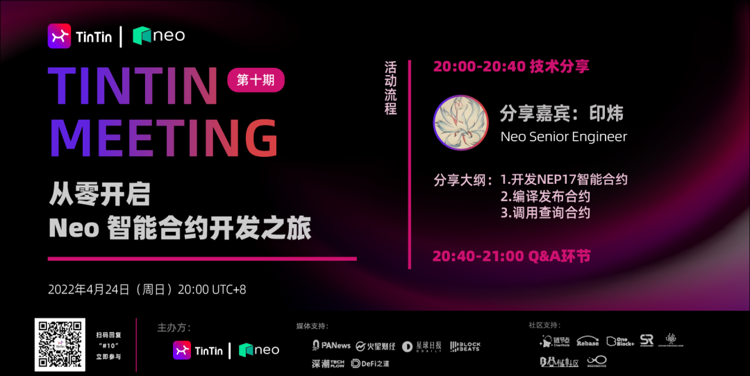 本期 TinTin Meeting 邀请了 Neo 的高级开发师印炜来作为技术分享嘉宾。本期的技术分享主题为「从零开启 Neo 智能合约开发之旅」。分享会上,印炜工程师以 C# 为例,通过编写、开发和运行简单的智能合约,让大家认知到,在 Neo 上面使用 Web2 的编程语言就能直接进行区块链开发。同时让开发者了解到了 Neo 上的智能合约框架,帮助开发者能够0基础快速掌握智能合约的编写与调试。